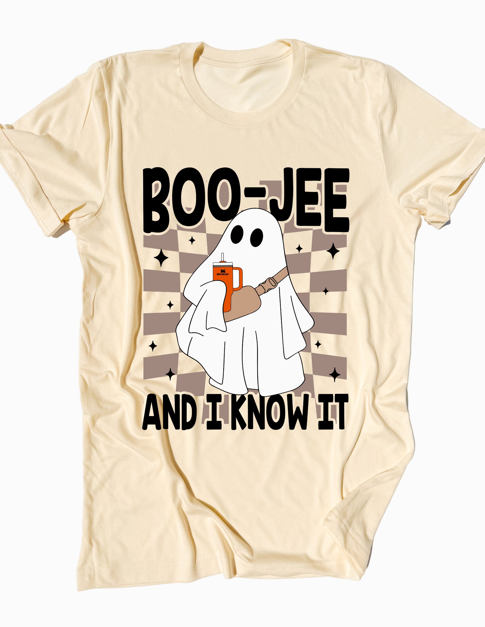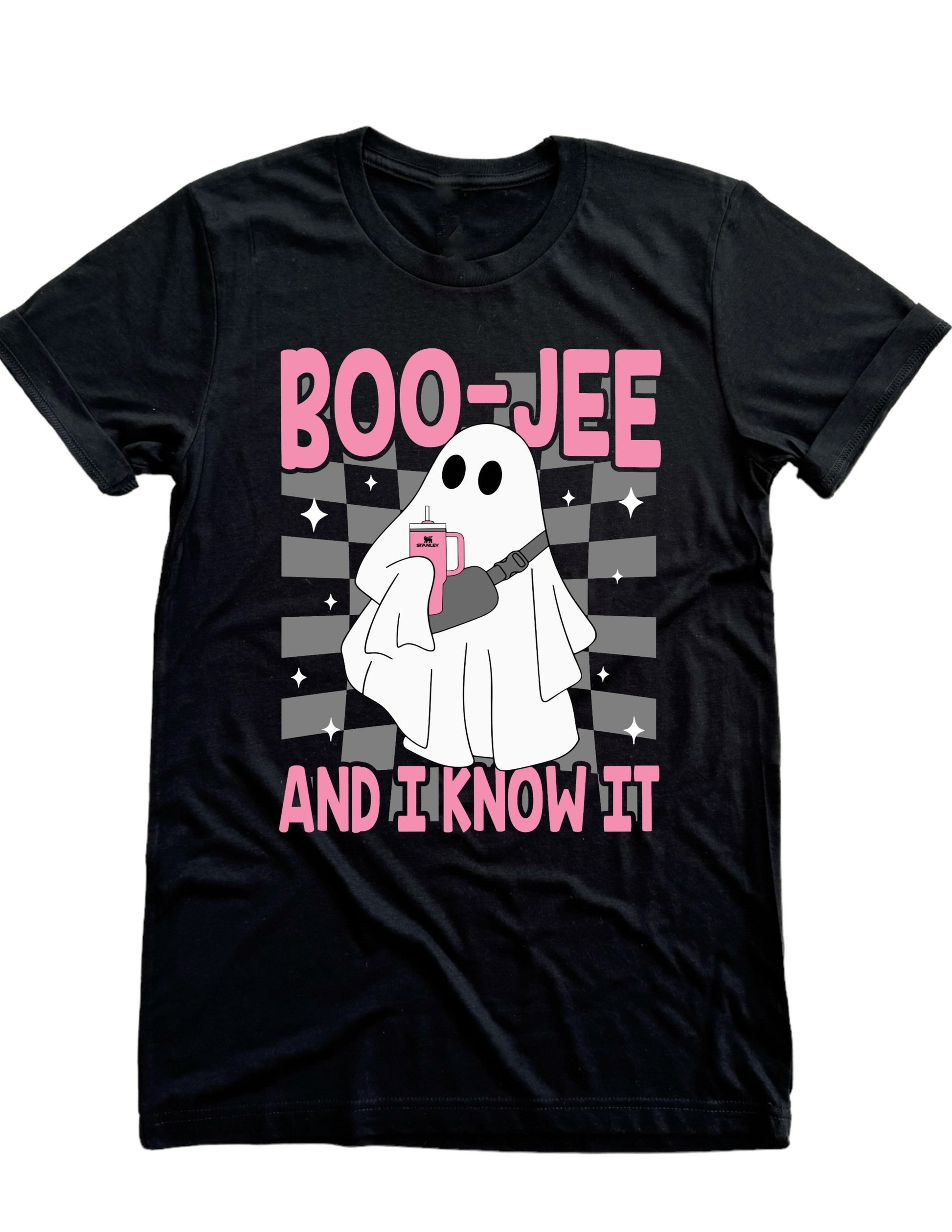 Get your spooky on with our Boo-jee and I know it shirt! Featuring a hilarious ghost sporting a stanley and fanny pack, this Halloween version is sure to be a hit. Get ready to turn heads and have a boo-tiful time in this quirky and playful shirt.
