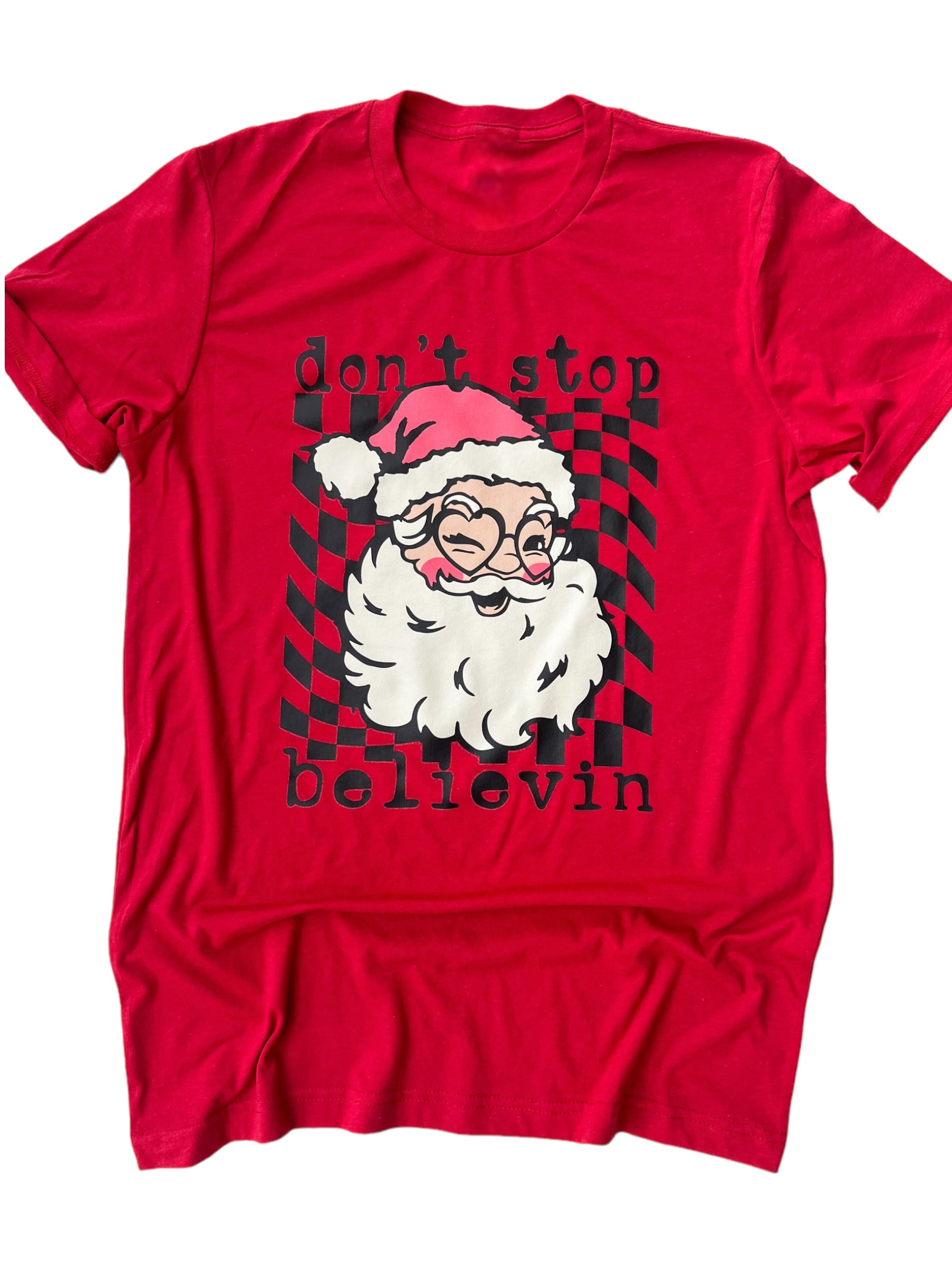 Spread the Christmas cheer with 'Don't Stop Believing!' This festive shirt features Santa and a punny message. Show the world why it's time to believe in the magic of the season! And why not?! 🎅