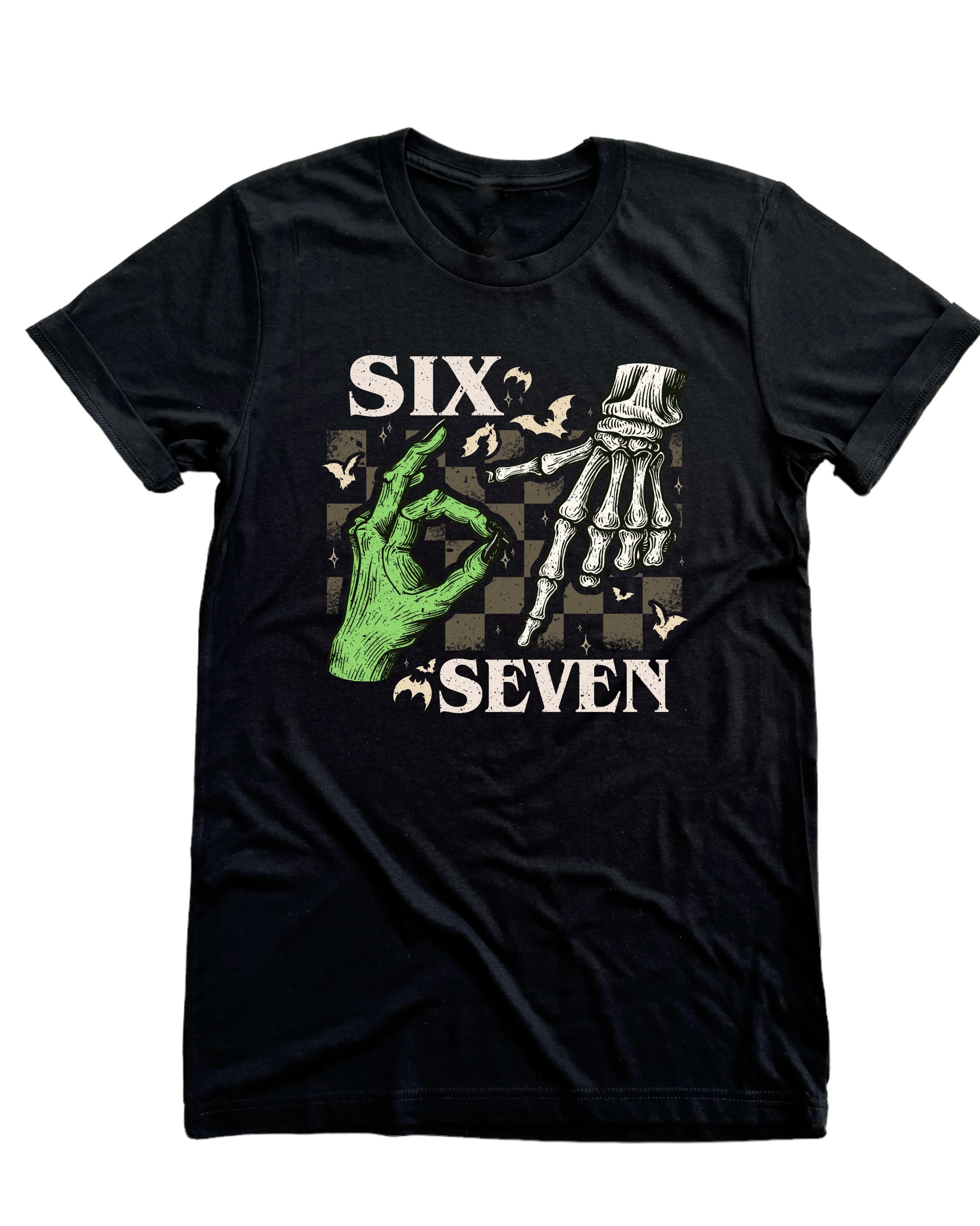 Embrace the Six Seven trend with this playful Halloween design featuring witch and skeleton hands forming the numbers six and seven. This unique apparel blends spooky charm with trendy style, making it a fun choice for celebrating the season or adding a magical twist to your everyday look. Perfect for those who love a clever, festive statement.