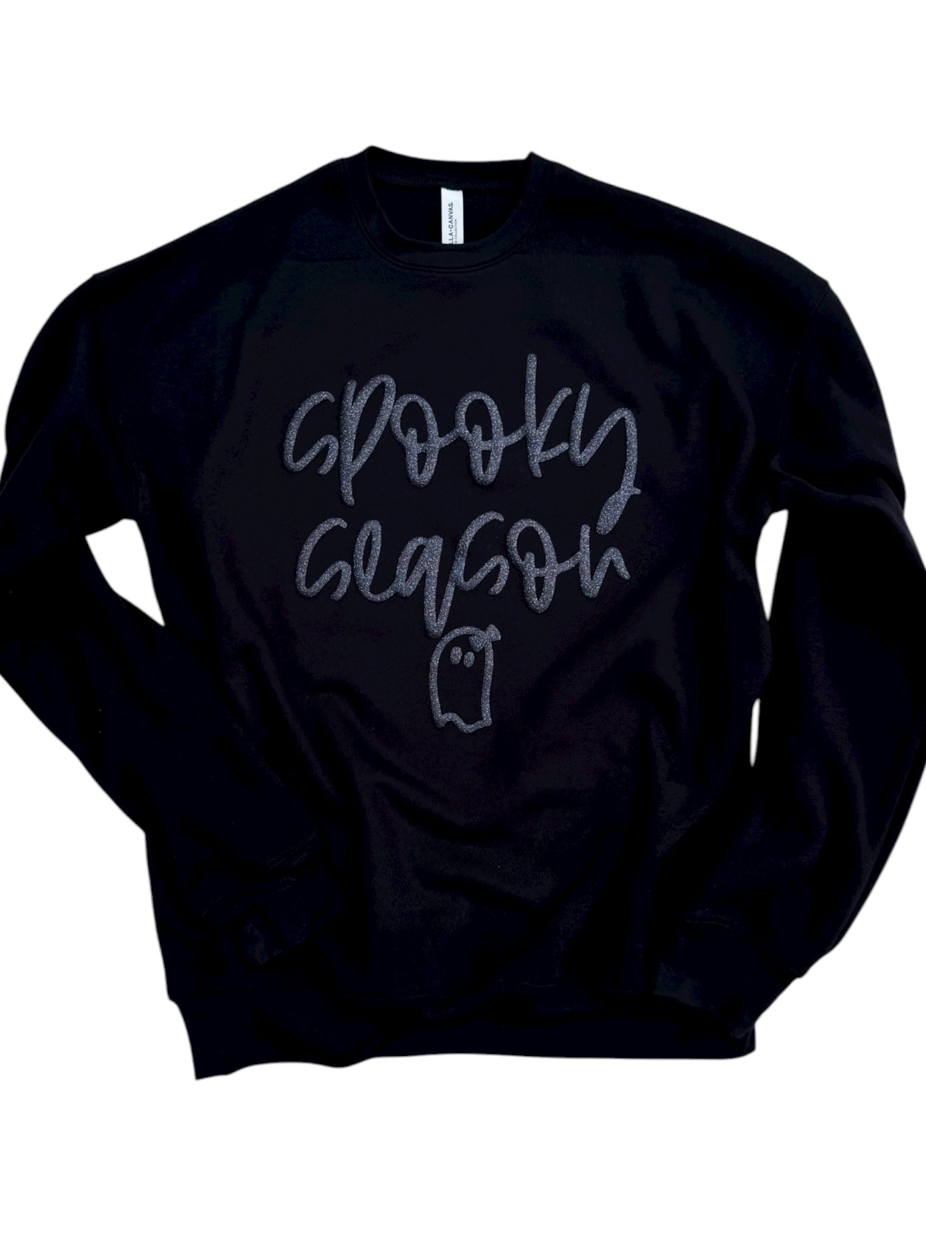 Celebrate the fun of the season with this playful black glitter puff featuring a charming "Spooky Season" design. Adorned with a friendly ghost and a cute bow, it adds a touch of whimsy to your autumn decor or outfit. Perfect for embracing Halloween vibes with a sparkling twist!